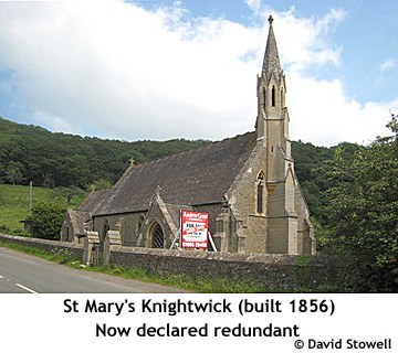 Doddenham and Knightwick are separated by the River Teme. Both parish churches, St Andrew at Doddenham & St Mary at Knightwick, were pulled down in the 19th century. A new St Mary's was built in 1856 on the north side of the river to serve both parishes. To the south of the river the old St Mary's church site was used to build a mortuary chapel in 1879.